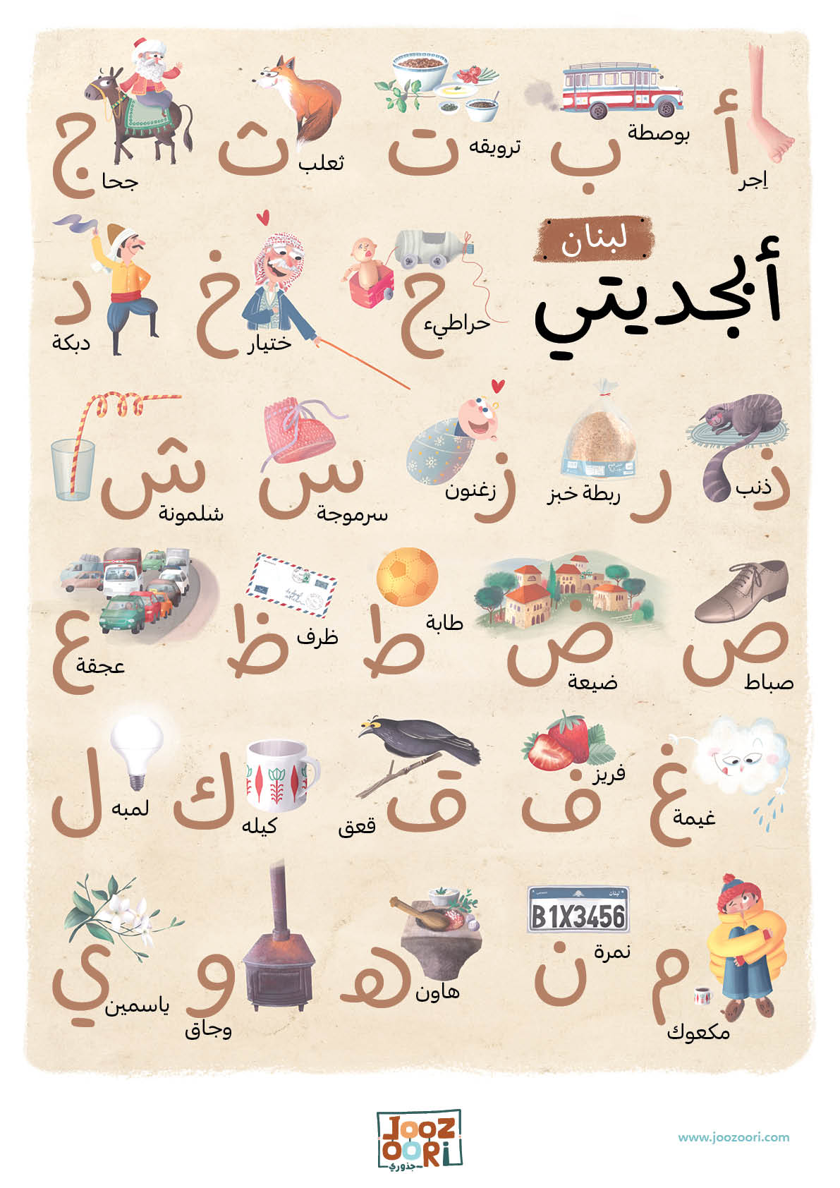 Faites découvrir à votre enfant l'alphabet arabe avec des exemples inspirés du dialecte libanais. Dimensions : A2 Cadre : Non inclus Conditionné en tube