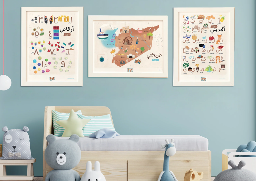 Initiez votre enfant aux lettres de l'alphabet arabe avec des exemples tirés du dialecte syrien. Dimensions : A2 Cadre non inclus