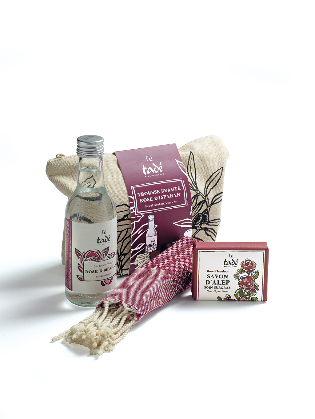 Rituel de beauté senteur Rose d’Ispahan dans une jolie trousse de coton biologique, idéal pour offrir ou s’offrir un moment de détente. Eau de beauté Rose, savonnette Rose, linge d’invité rose, trousse de toilette. COFFRET BEAUTÉ À LA SUAVE FRAGRANCE DE ROSE La variété de rose ancienne développée à Ispahan, ex capitale perse surnommée "la cité des roses", demeure jusqu'à aujourd'hui la plus renommée en raison de son parfum subtil et complexe, aux notes à la fois herbacées et fruitées. Pour une peau veloutée et parfaitement nettoyée, utilisez le savon d’Alep saponifié aux généreuses huiles d’olive et de laurier. Avec un gant, faire mousser sur le visage mouillé et rincer soigneusement. Puis à l’aide d’un coton, appliquez l'eau de beauté tonique pour donner éclat et fraîcheur à votre teint. Elle s'emploie aussi directement en démaquillant. Achevez ce soin visage avec la serviette de coton Bio, toute douce à la peau. ©Tadé