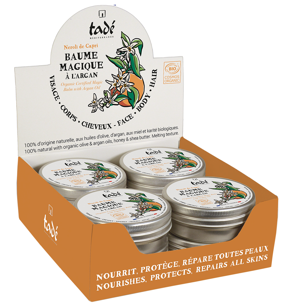 Baume précieux à l’huile d’argan, délicatement parfumé à la néroli envoûtante de Capri. Certifié bio COSMOS ORGANIC, il nourrit, hydrate et protège le visage, le corps et les cheveux. Le Baume Magique Tadé est un soin 100 % actif, formulé à partir d’ingrédients naturels réputés pour leurs vertus exceptionnelles : Beurre de karité : nourrit intensément la peau, améliore son élasticité et apporte confort et souplesse. Huile d’argan : riche en antioxydants, elle hydrate en profondeur, protège et aide à la cicatrisation des petites irritations. Cire d’abeille : apaise, répare et nourrit la peau en profondeur grâce à sa richesse en acides gras. Elle contribue également à la cicatrisation des petites blessures. Huile d’olive : hydratante et protectrice, elle adoucit et revitalise l’épiderme. Polyvalent et naturel, ce baume multifonctions est l’allié idéal pour retrouver une peau douce, apaisée et protégée jour après jour.