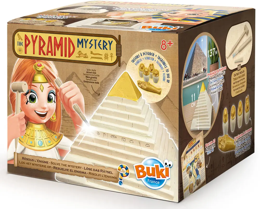 Déchiffre les hiéroglyphes gravés sur les 4 faces et trouve le mécanisme secret pour ouvrir la pyramide Déterre 5 trésors d’Egypte antique avec les outils inclus avec embout en métal ou lesté Expose ta pyramide et les trésors dans ta chambre Notice illustrée et poster A3 en couleurs Dès 8 ans